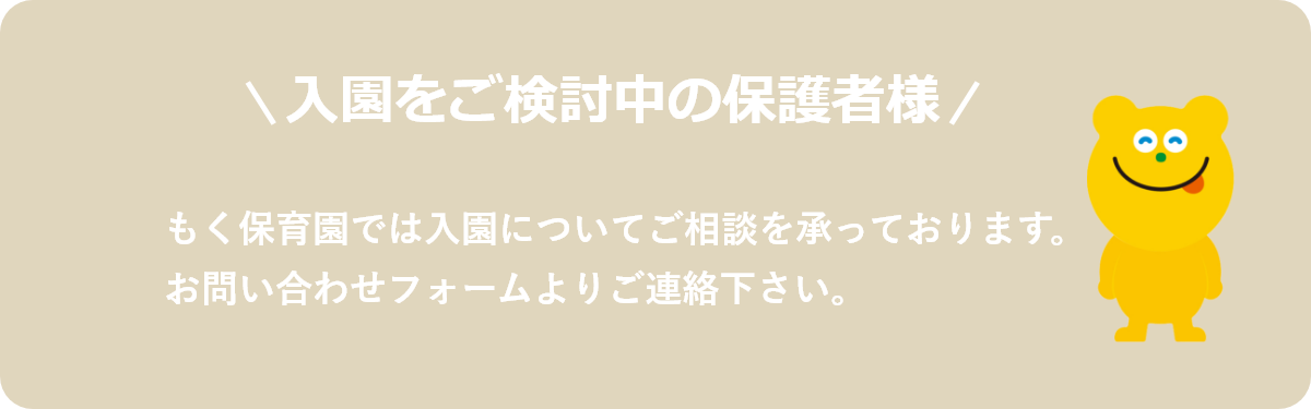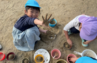 身の回りのものに親しみを感じ、様々なものに興味や関心を持ち、感性が育つ。生活や遊びの中でいろんなものに触れ、音、形、色、手触りなどに気付き、感覚の働きを豊かにするサポートをいたします。